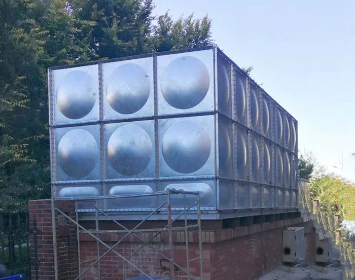 鍍鋅鋼板水箱是按照02S101制造生產的新型裝配式水箱,采用Q235鋼板,沖壓形成1000*000和1000*500 500*500的標準塊,周邊鉆孔,經鍍鋅處理,現場進行組裝,組裝時標準塊之間硅膠密封,螺栓連接。該水箱制造、安裝均不受土建施工影響,不用焊接設備,表面采用熱鋅防腐處理,美觀,以免水質二次污染,并符合建筑產品標準化、系列化、工廠化要求。